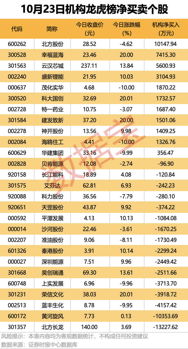 今日龍虎榜中,凈買入個股有11只,凈賣出的個股為16只。10股凈買入金額均超千萬元,北方股份獲機構凈買入1.01億元,居首;其次是幸福藍海、云漢芯城、盛新鋰能,均獲凈買入超3100萬元。