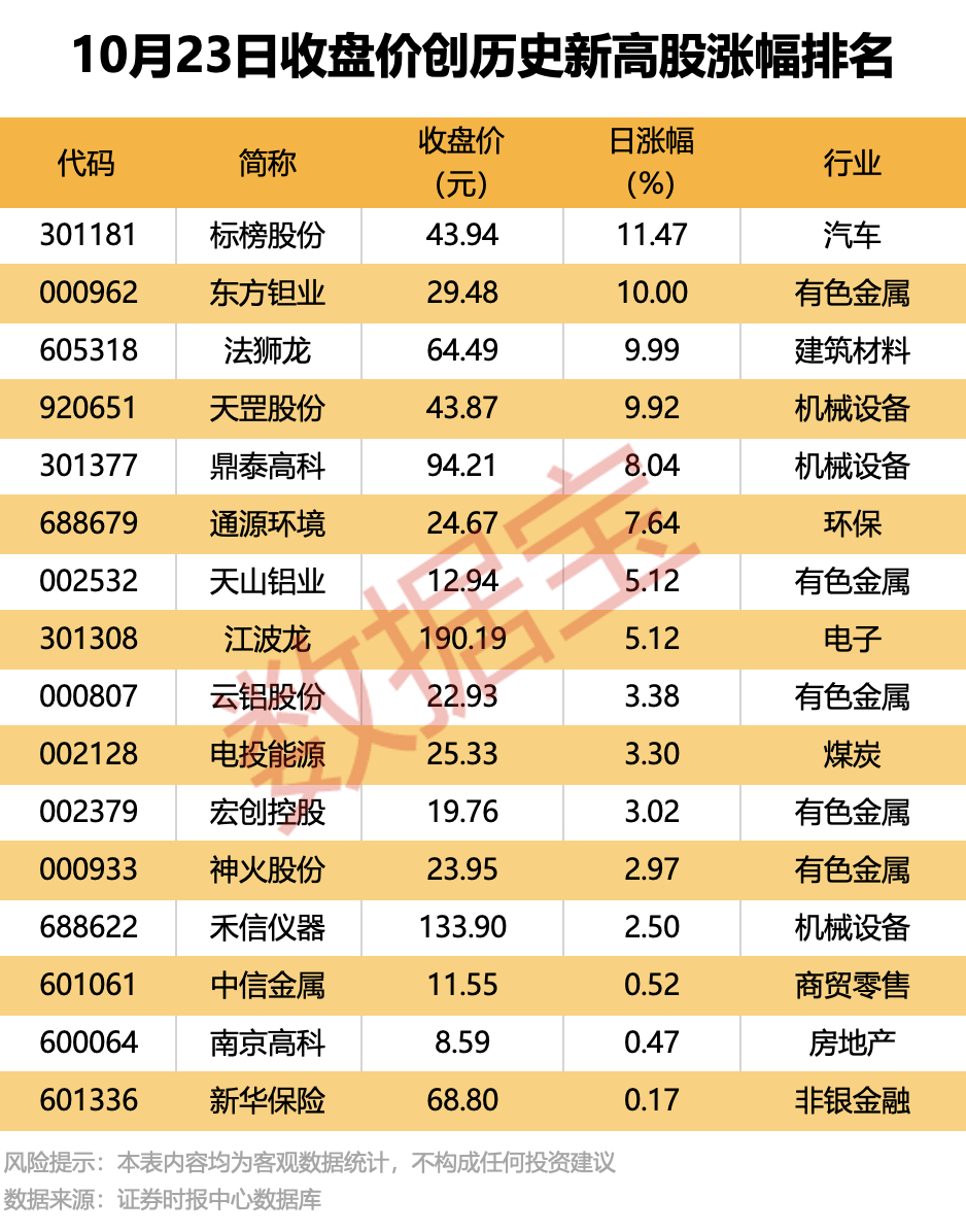 據證券時報·數據寶統計,不含近一年上市的次新股,今日共有16股收盤價創歷史新高。從行業屬性來看,有色金屬、機械設備行業創新高的個股較為集中,分別有5股、3股出現在名單中。