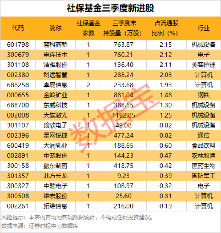 從持股比例看,新進(jìn)股中社保基金持有比例最多的是藍(lán)科高新,持股量占流通股比例為2.15%;其次是電連技術(shù),社保基金持股比例為2.12%;持股比例居前的還有潔雅股份、科遠(yuǎn)智慧、卓易信息等。