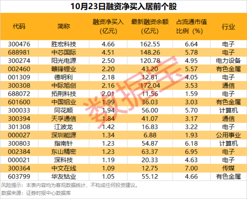 具體到個(gè)股,10月23日獲融資凈買入千萬元以上的有384只,其中17只融資凈買入額超1億元。勝宏科技融資凈買入額居首,當(dāng)日凈買入4.66億元;其次是中芯國際、陽光電源,融資凈買入金額分別為4.51億元、2.50億元;融資凈買入金額居前的還有贛鋒鋰業(yè)、德明利、中際旭創(chuàng)等。